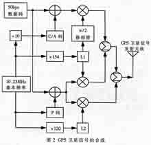 GPS卫星信号采用典型的码分多址(CDMA)调制技术进行合成(如图2所示),其完整信号主要包括载波、伪随机码和数据码等三种分量。信号载波处于L波段,两载波的中心频率分别记作L1和L2。卫星信号参考时钟频率f0为10.23MHz,信号载波L1的中心频率为f0的154倍频,即: